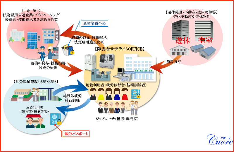 ・就労移行及び支援範囲、業務獲得を拡大充実化させるための設備及び訓練プログラムの構築、サテライト化、